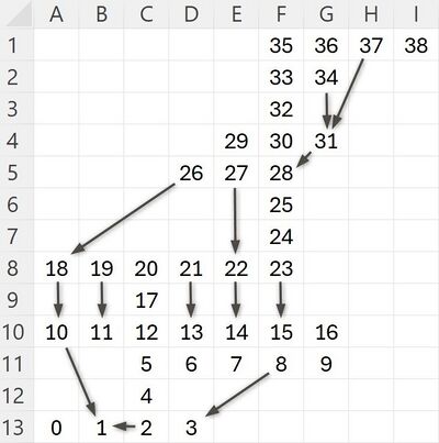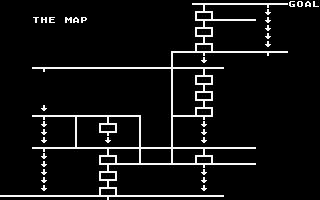 Starting from room number 0 (bottom left), the goal of the game is to guide Shamus across the entire Shadow fortress to his cave (room number 39, top right) and initiate the destruction of the complex. The path is blocked at four points by locked doors (see illustration on the right), so Shamus must first collect the corresponding key for each door. The keys, as well as the extra lives that can be collected along the way, can be found in numerous locations throughout the labyrinth and look like small padlocks (image left).