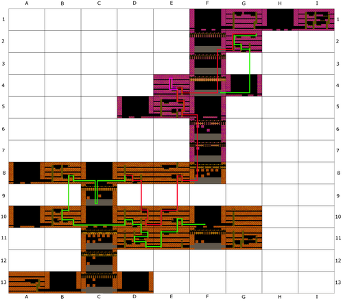 The following gallery shows—divided into four sections for clarity—the path to the control room, from which the detonation of Shadow's castle can be triggered (Images 1–3), and the subsequent return to the starting room (Image 4). Paths with a key are shown in green, paths without a key are shown in red. Detours that serve only to acquire extra lives are colored purple.