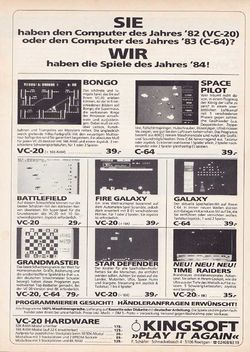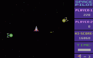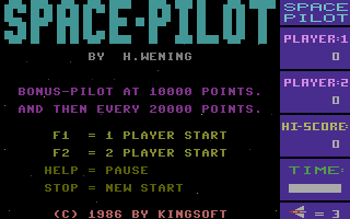 Space-Pilot is a multi-directionally scrolling shooter by Kingsoft from 1984. The player steers a figher jet, which has obviously been equipped with a time machine, through 5 time zones, in which he has to defend himself against hostile flying armed forces fitting the corresponding epoch. If 56 hostile machines have been destroyed, a mother ship appears which can be shot with 5 shots, whereupon the time jump to the next era follows.