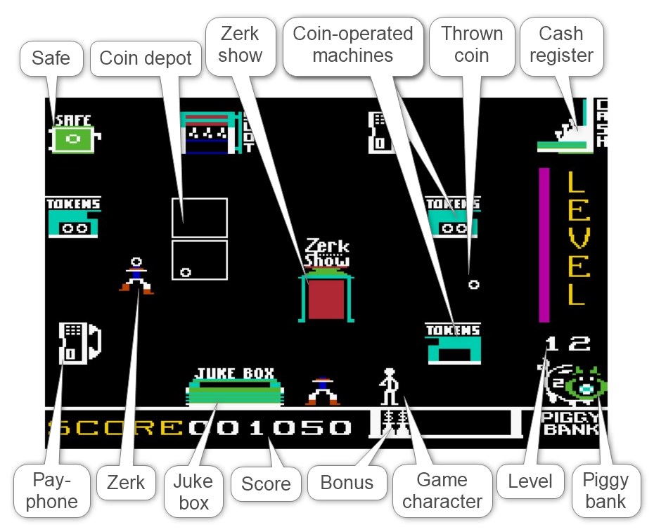 The player must therefore constantly be vigilant in preventing the Zerks from stealing coins. Fortunately, the Zerks can be easily distracted for a while — by the player inserting a coin into the jukebox provided at the bottom of the screen, allowing the Zerks to dance to the music, and in some rounds also by the player inserting a coin into one of two telephones, encouraging the Zerks to make a phone call, or by starting a popcorn machine, around which the Zerks then stand admiringly.