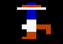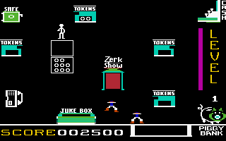Both the player-controlled character and the two opposing Zerks are very small and move rather hectically and jerkily; furthermore, the Zerks are displayed as individual multicolor sprites and therefore only have a resolution of 12x16 pixels (where each pixel consists of two horizontally adjacent screen pixels). This rather meager rendering is, however, compensated for by the remarkable independent spirit these scoundrels develop: If the arcade owner snatches their loot back, they fly into a rage and stamp their feet in fury; they throw or kick the stolen coins toward their piggy bank; from time to time, they collide and then have to sit down, dazed; and when cornered by the player, they occasionally secure their loot by tossing it to each other.