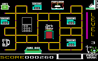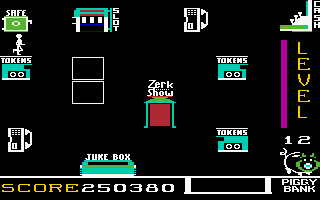 - If you are less concerned with reaching higher levels and primarily want to maximize your score, it is recommended to collect exactly 10 coins in the depot each round, then wait until one of the Zerks steals another coin from the depot, and then go to the Zerk Show as quickly as possible. This way, you receive no bonus, remain permanently on the easy first level, and can accumulate points indefinitely.