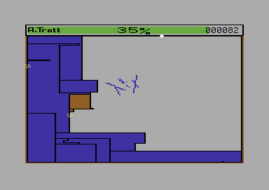 The controls are either done by joystick or the keyboard. To create a new force field, the fire button needs to be pressed at the same time with the movement of the stick. When you keep the fire button pressed during the creation of a force field, the speed will be slowed down, which has the effet, that you can reach a higher score. You will get 20 points per 1% of filled area instead of only 2 points. When you have filled 75% of the area the level is done.