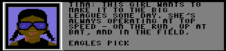 After having decided for one of the two game fields, you can choose between human opponent or the CPU. Then comes the always exciting part in real life, choosing the members of the team. By a coin thrown, it is decided who is first in choosing the team from the pool of 16 boys and girls. If you want, you can also let the assigment be done randomly, which is definitely faster and can give a buzz to professionals. For each player you get shown a portrait and bit of information that is supposed to facilitate your choice. Now you have to assign a player to a position and select the order of the batters (or accept the corresponding suggestions) and then your are ready to go out on the field!