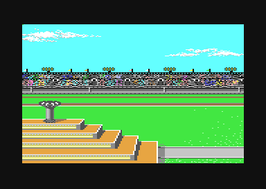 At Javelin Throw you need to throw the spear as far as possible. When the player runs you can speed him up by pressing continuously on the fire button. Just before the line you should draw the joystick to the left until the spear is in the right throwing position. By the combination of speed and throwing angle will be decided how far the spear flies.