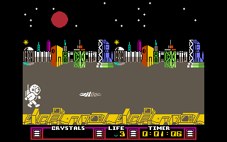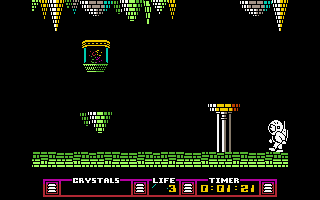 The enemy astronaut steals one of the crystals our astronaut has collected. In this case, however, the crystal is not lost forever, but reappears elsewhere in the labyrinth and simply needs to be collected again. The monkey with flapping ears cannot be shot down and permanently drains Charlie's energy upon contact.