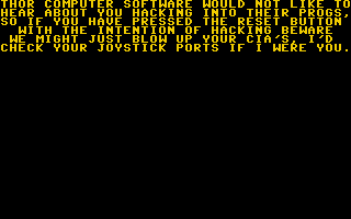 The game's authors attempted to make analyzing and saving the program code of "The Arc of Yesod" more difficult by using the identifier "CBM80" at address $8004 to simulate the presence of a plug-in module, so that when the computer is reset, it is not reset, but only the following ominous threat appears on the screen:
