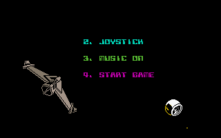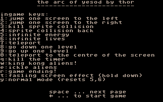"The Arc of Yesod" can be controlled either with a joystick in port 2 or with the keyboard. The selection between these two input devices can be made via a menu on the start screen before launching the game by selecting "4. START GAME". The following mapping then applies: