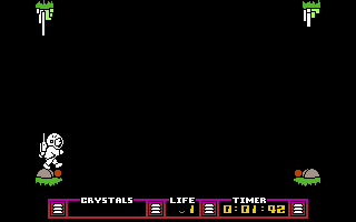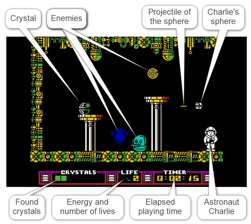 There are also a total of 8 astronaut helmets in the labyrinth's corridors, each of which grants Charlie an extra life, provided he hasn't already reached the maximum of 9 lives. These helmets also replenish his supply of bombs up to a maximum of 6. With these bombs, Charlie can paralyze or remove some of his opponents from the current screen for a limited time.