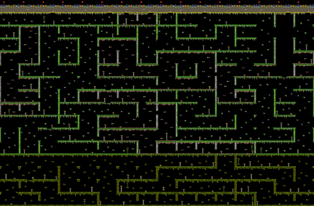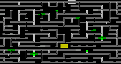 The following animation shows an example of the starting position of all objects to be collected (crystals in green, extra lives in white) as well as the location of the starting room (gray rectangle) and the monolith (yellow rectangle) in 60 consecutive games. Only some of the rooms are used for placing objects; these are randomly permuted before the start of each game. Normal paths are shown as double lines in this representation, while passages to be opened from the sphere are shown as single, horizontal lines. Single, vertical lines represent trapdoors.