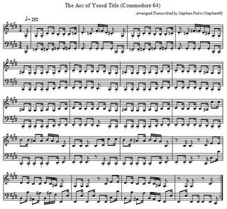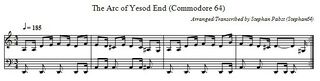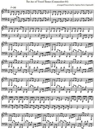 The musical score consists of three two-part melodies that play during the display of the start menu, during gameplay, and at the end of the game. The following gallery shows these melodies in standard musical notation. For creative reuse, the sheet music is also available as a PDF document (File:ArcOfYesod PDF.pdf) and in ABC musical notation (File:ArcOfYesod.abc.txt).