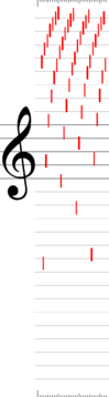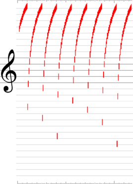 Numerous events in the game, such as picking up an object or colliding with an opponent, are accompanied by short sounds from SID Voice 3. Sometimes this is done with the noise generator, producing a short hiss or pop, and sometimes with other waveforms. In the latter case, the characteristic sound results primarily from the precise frequency response. The following gallery illustrates this by plotting the temporal evolution of the pitch at a resolution of 0.5 ms (2000 pixels/s in the original resolution) on a musical staff diagram. The scale at the top and bottom of the diagrams is divided into 10 ms segments.