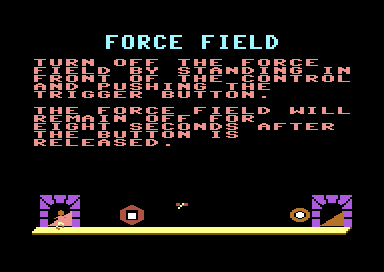 - Force Fields are glimmering walls that block some ways. They cannot hurt you but avoid to get into a dead end behind a force field. The hexagonal red-white button allows you to switch off the force field for a short time. Stand in front of it and press the fire button. The white part of the button disappears and the force field is switched off. During the next 8 seconds the white part of the button reappears. When the button is full again the force field reappears.