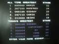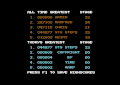 • In the highscore list the name is entered over the keyboard and finished by pressing the "Return" key. By pressing "F1" the highscore list is saved on disk. By pressing the fire button after you have finished entering the name, the game is restarted without saving the highscore list.