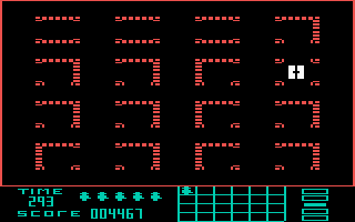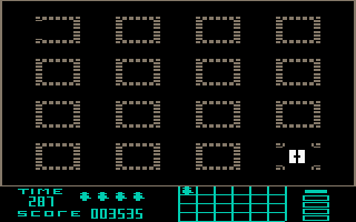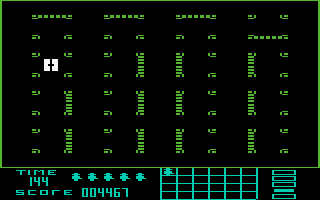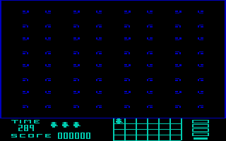 The F7 key toggles the background music on and off. The F1 key allows the player to select the waveform of the music playback, thus influencing the sound of the background music. Pressing the RUN/STOP key exits the game and returns to the start screen.