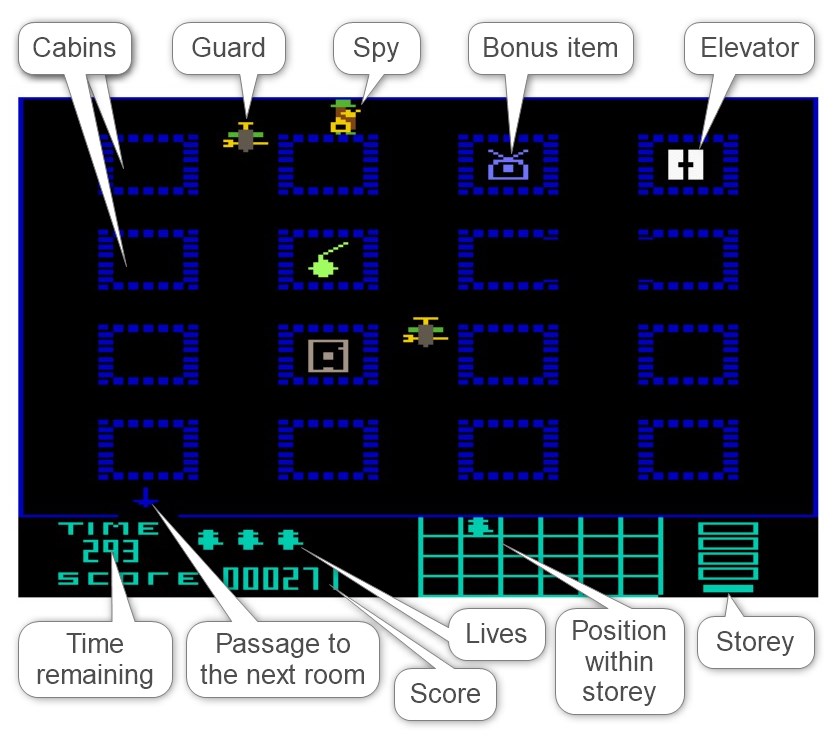 The terrorist's castle has five floors, each with 24 rooms that are very similar and displayed in full-screen mode. Each of these rooms contains 16 cubicles, between which the spy can hide and into which he can escape in case of danger.