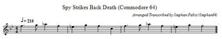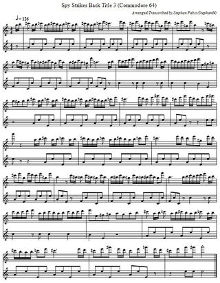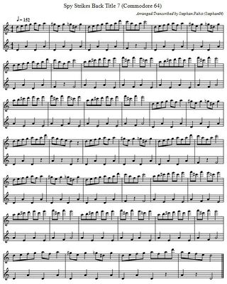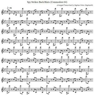 As long as the spy remains undetected between the booths, one of seven two-part background melodies will play. The left and middle illustrations in the following gallery show two examples of these musical pieces in standard musical notation. A monophonic funeral melody is played when the spy is arrested (right illustration). For creative reuse, the sheet music for all melodies is also available as a PDF document (File:SpyStrikesBack Theme PDF.pdf) and in ABC musical notation (File:SpyStrikesBack Theme.abc.txt).