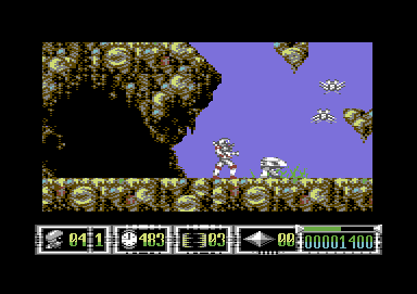 The hero is steered through 11 levels by joystick in controlport 2 and the keyboard. Turrican has 3 normal weapon systems, the multiple scatter shot, the laser and the bounce shot. These can be activated or upgraded by extras that fly around or are hidden inside bonus blocks. Additionally, there are the bonus weapons. By pressing the fire button (joystick) for a long time, the surround flash is activated and also works in a crouch. The surround flash can be enlarged by picking up extras. With the space key you activate power lines, which are limited but can be filled up with extras. If you pull down the joystick and press the space key, Turrican turns into a wheel and can go on shooting by pressing the joystick fire button. With the CTRL key the game is paused.