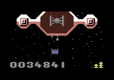 The really great title screen belongs to the best and most detailed a C64 can display. Unfortunately, that is not true for the game graphics. Although there have been three-dimensional elements integrated into the the background and the enemy sprites, the own spacecraft lacks such effects and looks rather odd. And except for some decorative elements, the background remains plain and dull. It is not always easy to determine whether a space base element is a target or just decoration. But this would have been preferable in respect of the objective and the total base destruct bonus you try to accomplish in every level.